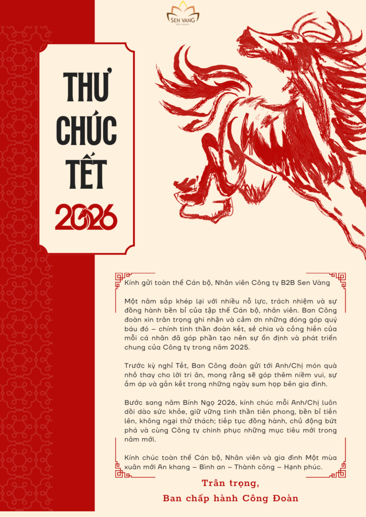 Kính gửi toàn thể Cán bộ, Nhân viên Công ty B2B Sen Vàng Nhân dịp Tết Nguyên đán Bính Ngọ 2026 đang đến gần, Ban Chấp hành Công đoàn Công ty B2B Sen Vàng trân trọng gửi tới toàn thể Cán bộ, Nhân viên và gia đình lời chúc mừng năm mới sức khỏe, bình […]